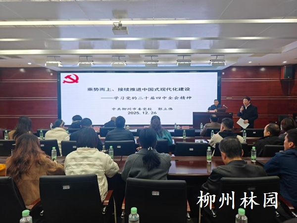12月26日,市林业和园林局在马鹿山奇石馆多功能厅举办学习贯彻党的二十届四中全会精神专题宣讲会,会议邀请中共柳州市委党校郭立伟教授作专题宣讲,局系统各单位中层以上干部共80人参加会议。