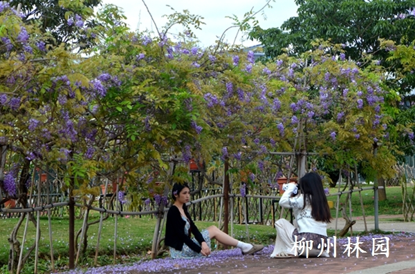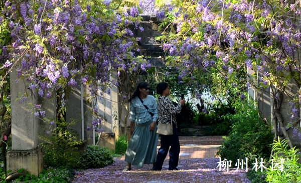 据悉,廊架上盛放的紫藤均为柳州市园林科学研究所科技人员精心培育的新优品种,科研人员通过嫁接技术,优化紫藤生长特性,提升花期观赏性,让这些紫藤花不仅花量更大、花色更艳,花期也更为持久,为园区增添一份春日生机。