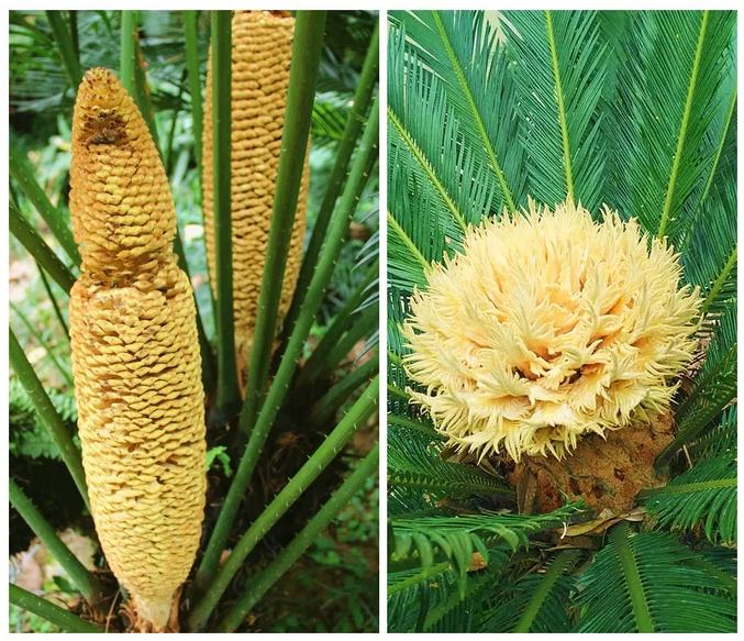 事实上,苏铁的“花”并不是严格意义上的花,因为它没有花瓣、花蕊等特征。但是大家一般都把苏铁雄株上的“小孢子叶球”称为雄花,将雌株上的“大孢子叶球”称为雌花。这也是为什么苏铁花有的像玉米,有的像绣球的原因了。