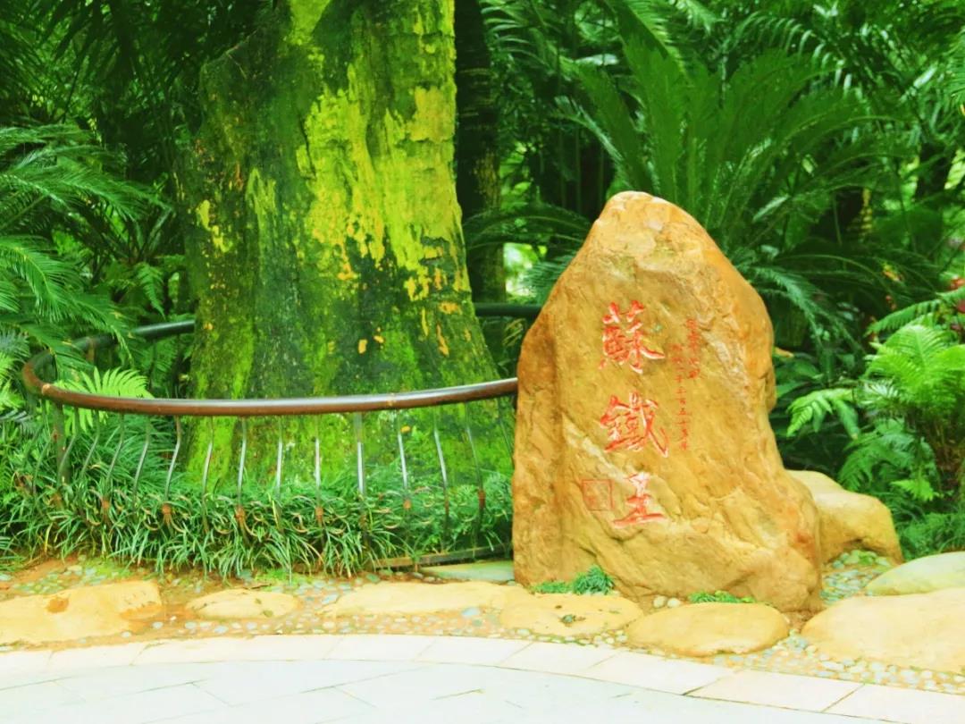 到了苏铁园,一定要看一看园内苏铁王。它高7.8米,树围最粗处3.8米,胸径0.95米,冠幅5.15米,是苏铁园树龄最长的苏铁,已有1360多年的历史。那么,这棵苏铁王是如何扎根青秀山呢?在1999年青秀山筹建苏铁园时,工作人员遍访各地寻找散落各地的苏铁,偶然发现了这株奄奄一息的苏铁,便把它带回精心栽培,从此它便在青秀山安了家。这株苏铁是国内现有记载树龄最古老的苏铁,也因此被称为“植物界活化石,苏铁中的极品”。