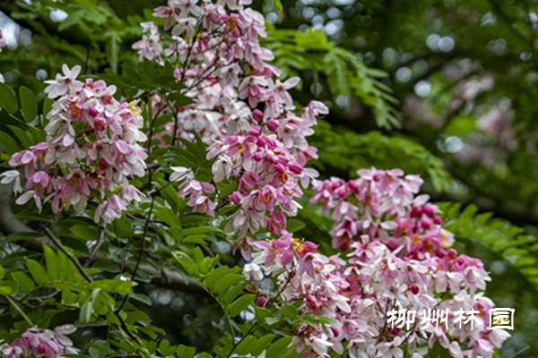 粉花山扁豆,又称美丽花,为苏木科铁刀木属常绿乔木,树型伟岸丰满,树冠像一把巨大的绿伞,枝叶碧绿清爽,每年初夏那美丽之花都会如期盛开,满树粉红如霞,蔚为壮观。据公园管理人员介绍,粉花山扁豆不仅具有很高的观赏价值,而且适应性强、生长旺盛,是南方园林绿化中常见的优良观花乔木,其盛放期一般可持续至六月中旬,成为龙潭公园初夏时节最具代表性的自然景观之一。