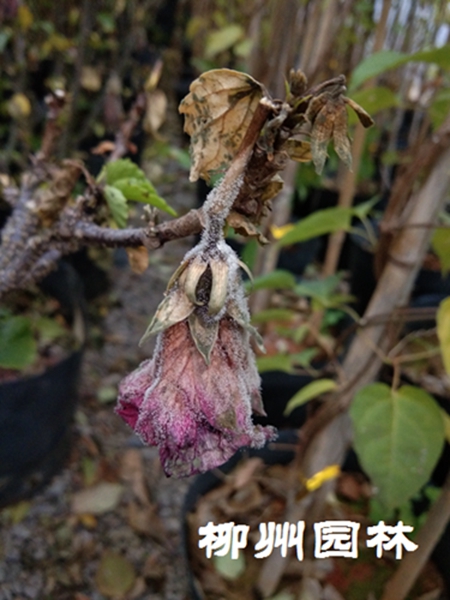 植物的枝、叶、花受寒害以后,连续阴雨天气,湿度大,易引发灰霉病。灰霉病属低温高湿型病害,属半知菌类真菌。主要危害叶片,初生水渍状病斑,病部扩散并蔓延到叶柄上,湿度大时,病部布满灰色霉层。