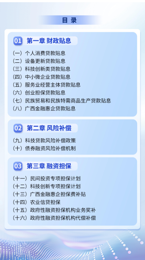 政策手册精准聚焦中小微企业、“三农”主体、科技型企业、服务业经营主体、民间投资主体、居民消费等重点服务对象,紧扣广西财政金融发展重点,清晰列明各项财金协同一揽子政策的支持范围、适用对象、补贴标准、政策期限及申报依据,并对政策执行口径与配套文件作出明确说明,将分散的广西特色惠企利民政策进行系统化梳理、清单化呈现、规范化解读、简洁化展现,让市场主体看得懂、用得上、享得到,推动政策红利直达快享。