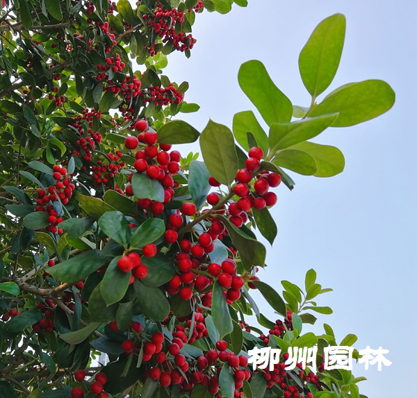 无刺枸骨,冬青科,常绿灌木或小乔木,为枸骨变种,树皮灰白色,平滑不裂。叶革质,无刺齿,表面深绿色有光泽,背面淡绿色,每年4~5月开花,果实初为绿色入秋成熟转红,满枝累累硕果,鲜艳夺目,经冬不凋,一般从当年10月延续到第二年3月份。无刺枸骨不但是很好的观赏树种,其枝叶、树皮均可入药,有较好的清热解毒,消肿止痛效果。