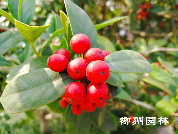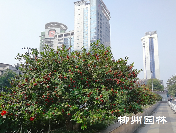 近日,经过市区五一路与龙城路交叉路口时,市民们会发人民广场绿化带上内小树上挂满红红火火的果实,喜上眉梢,甚是喜人,这种树木名叫无刺枸骨。